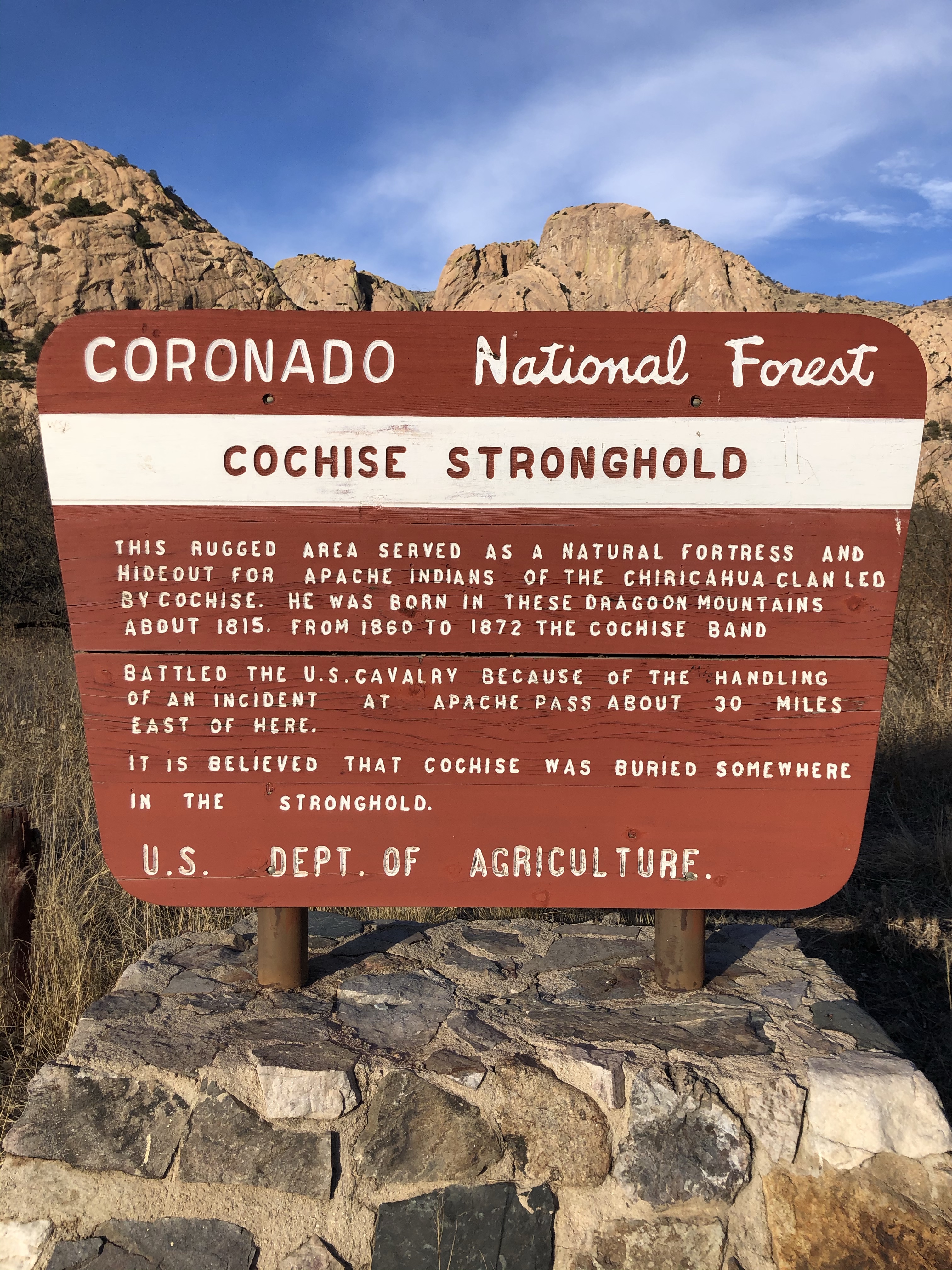 The Cochise Stronghold is a natural fortress nestled in the Dragoon Mountains, named for Chiricahua Apache Chief Cochise. He was born in the Dragoon’s, and used the Stronghold as a safe haven for his people from the 1850’s to the 1870’s, before being forced onto reservation lands. Most of the Chiricahua Apache were moved hundreds of miles away to a reservation in Oklahoma.